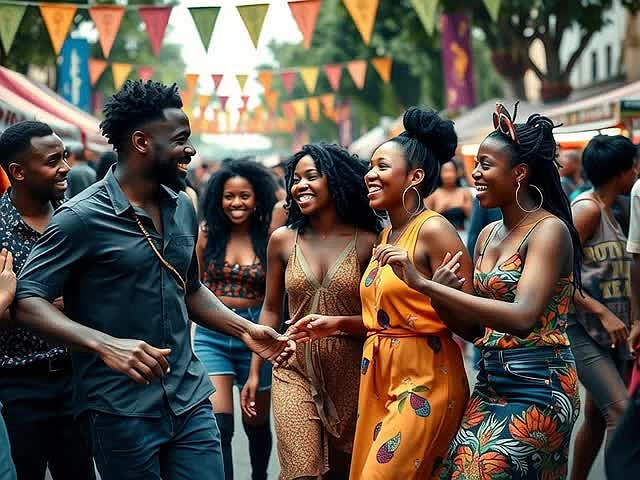 2. Diverse Group: A group of Black men and women are in the foreground, all smiling and enjoying each other's company. Their energetic expressions and body language convey joy and a sense of unity.